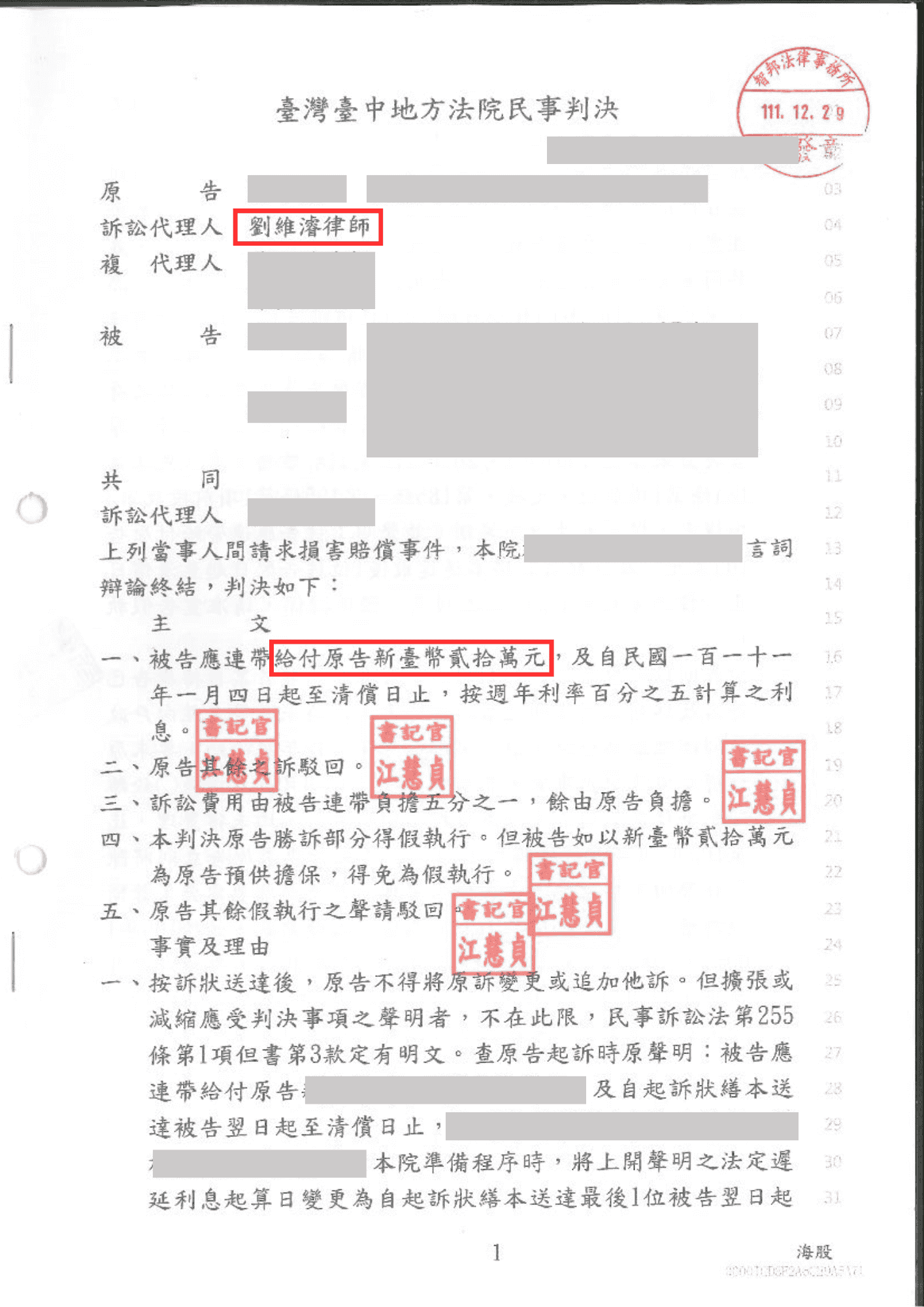 劉維濬律師侵害配偶權勝訴,獲賠20萬-法巢