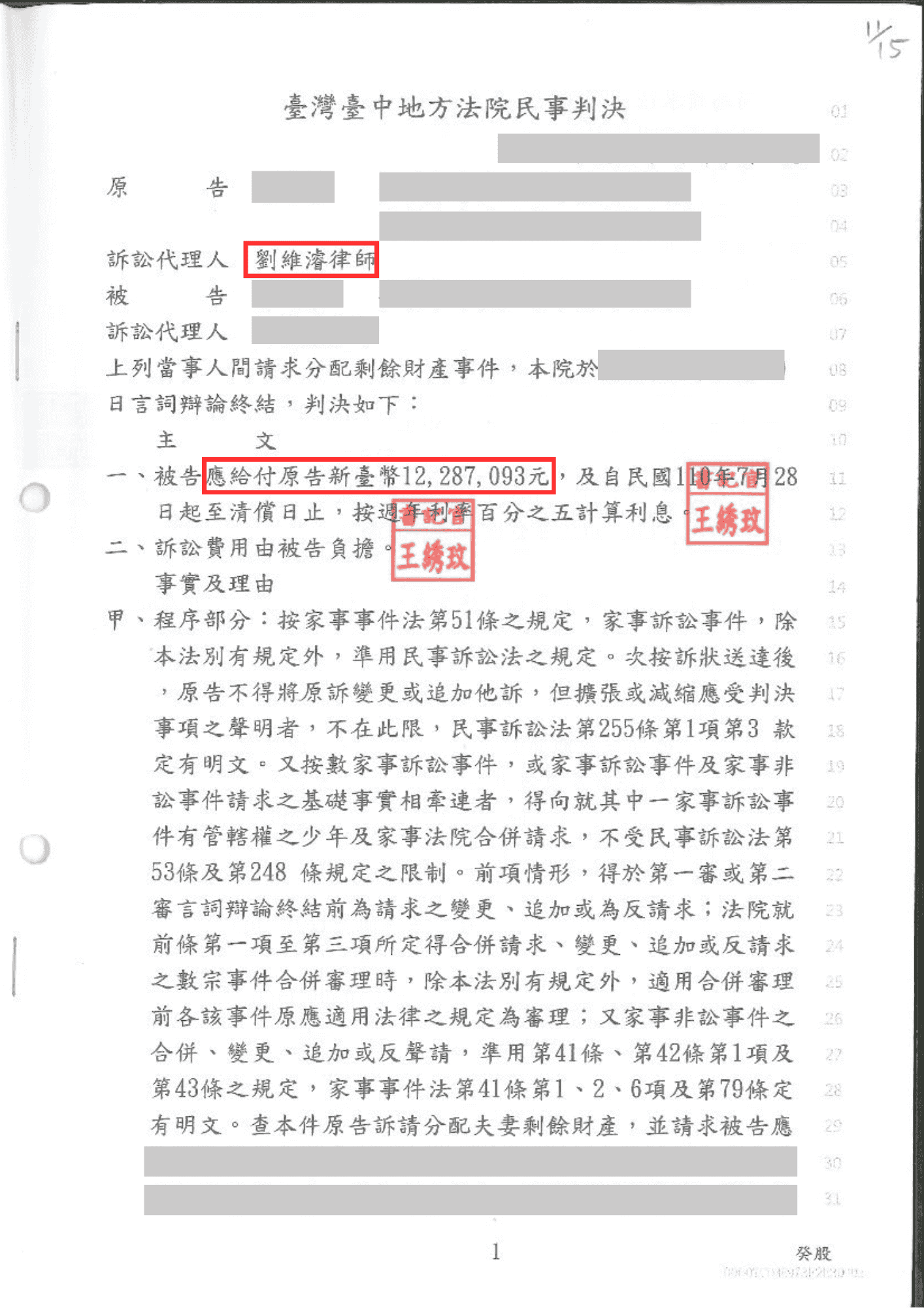 劉維濬律師剩餘財產分配勝訴,獲得 1200 萬-法巢