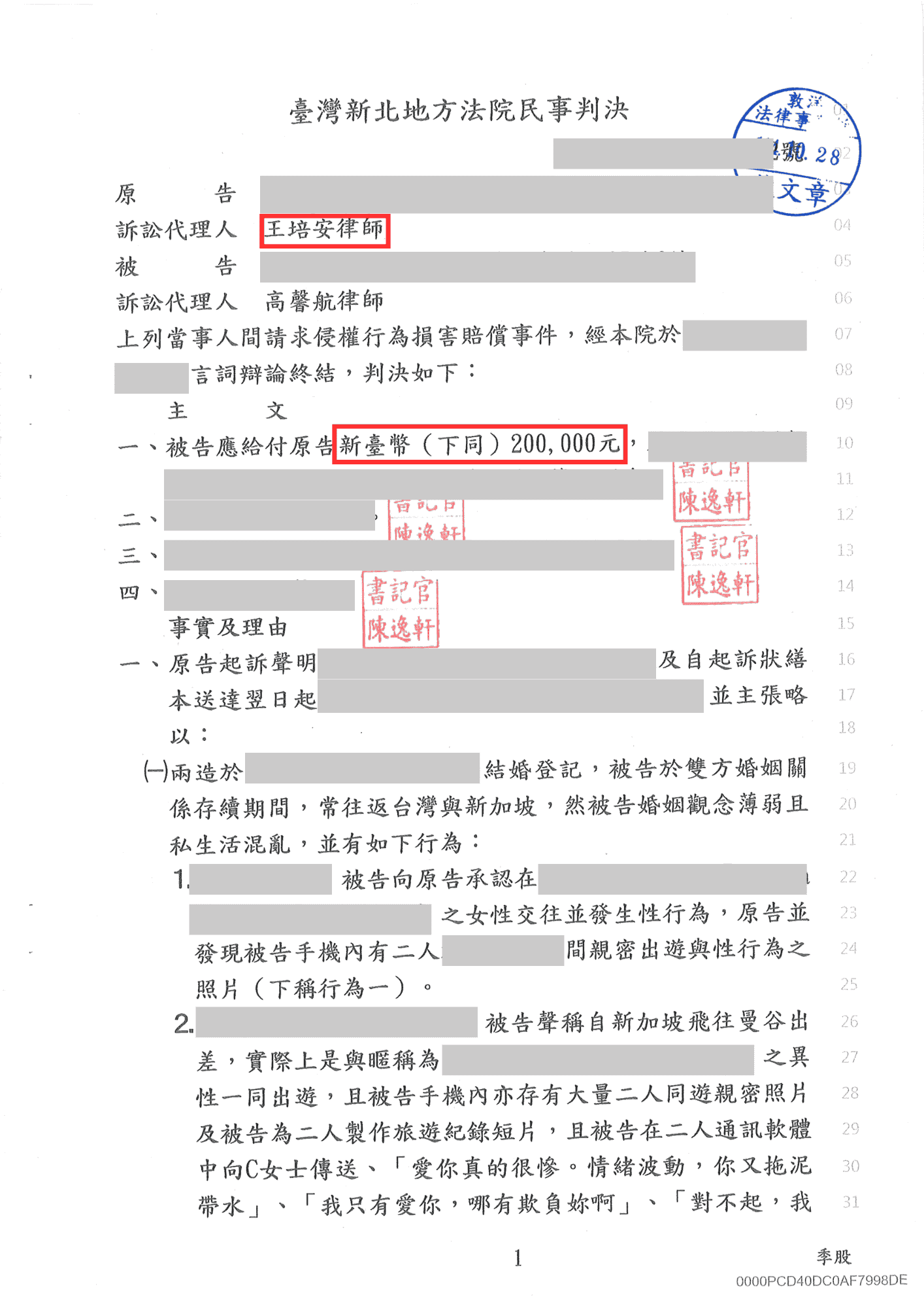 王培安律師侵害配偶權勝訴,獲賠 20 萬-法巢