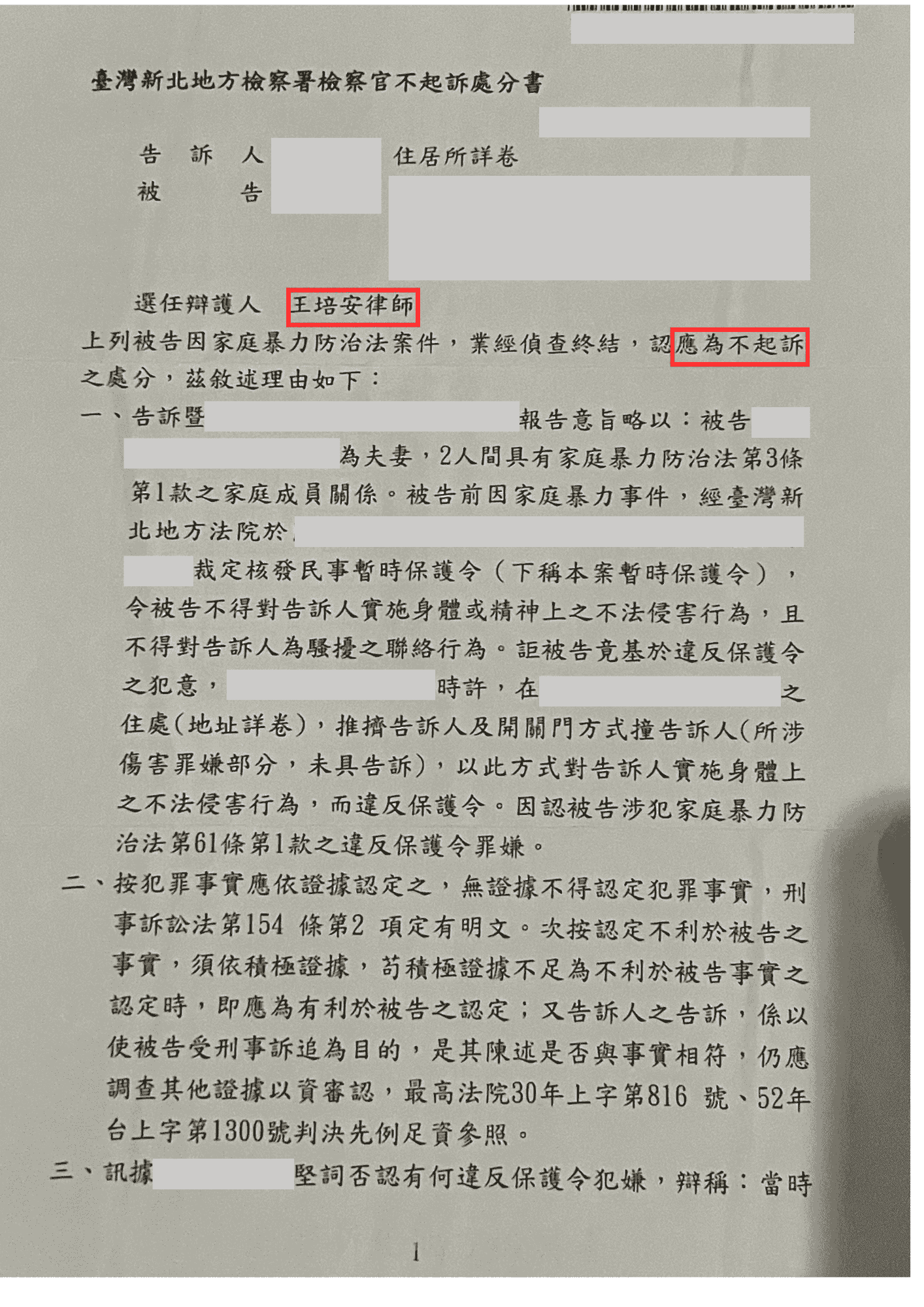 王培安律師勝訴,對方提告違反保護令失敗-法巢