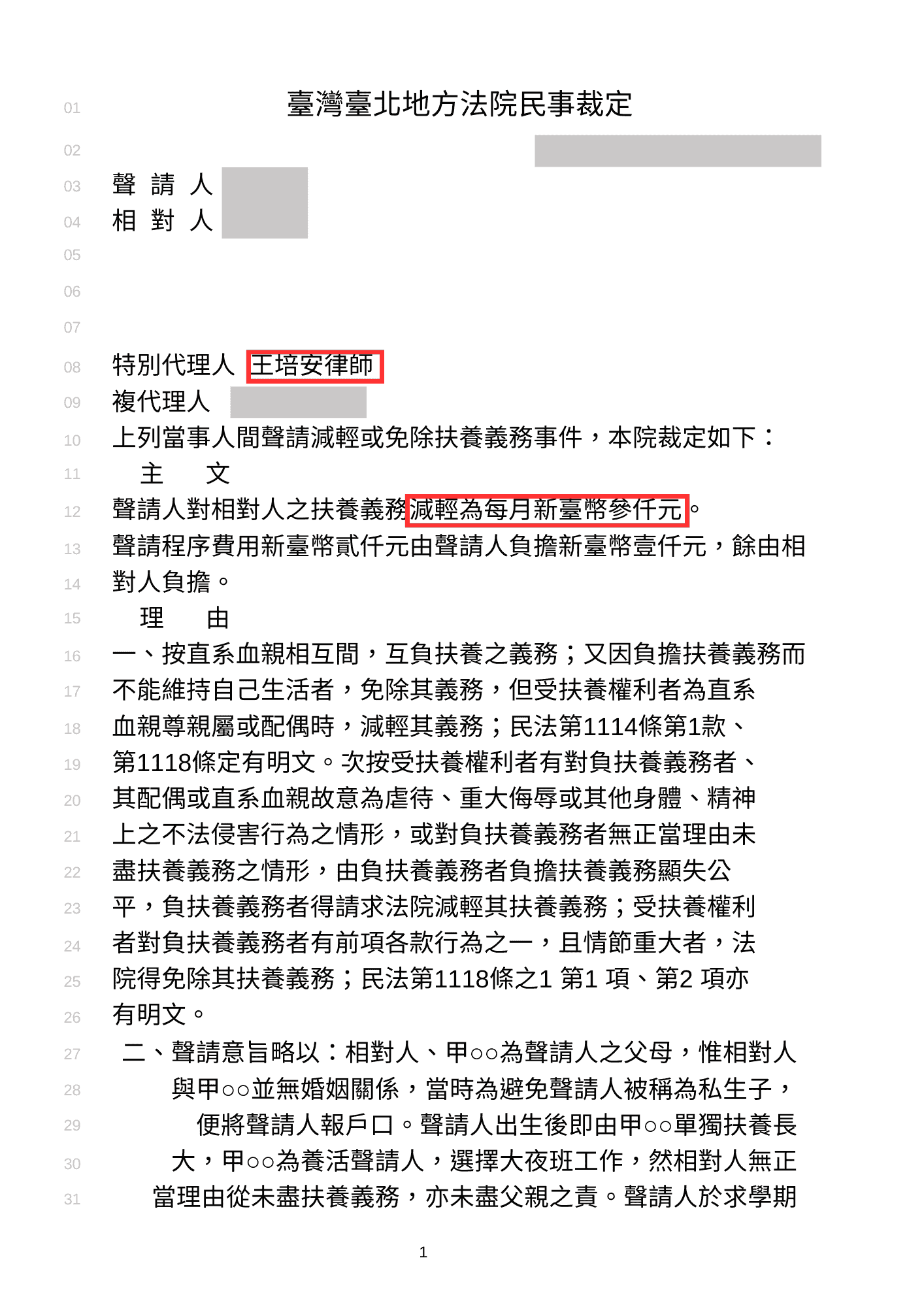 王培安律師減輕扶養義務勝訴,扶養費改為 3000 元-法巢