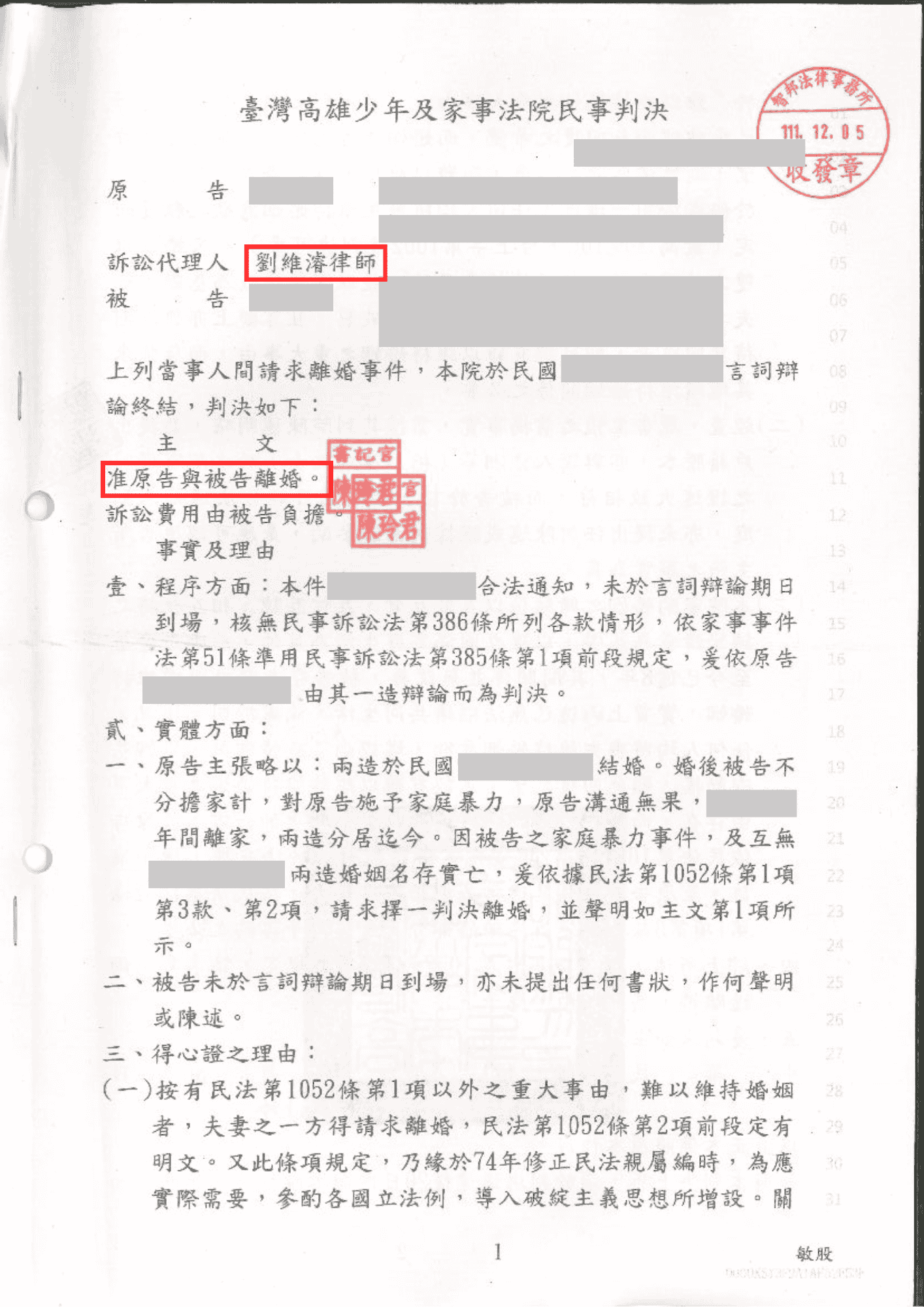 劉維濬律師離婚勝訴,配偶家暴分居,離婚成功-法巢