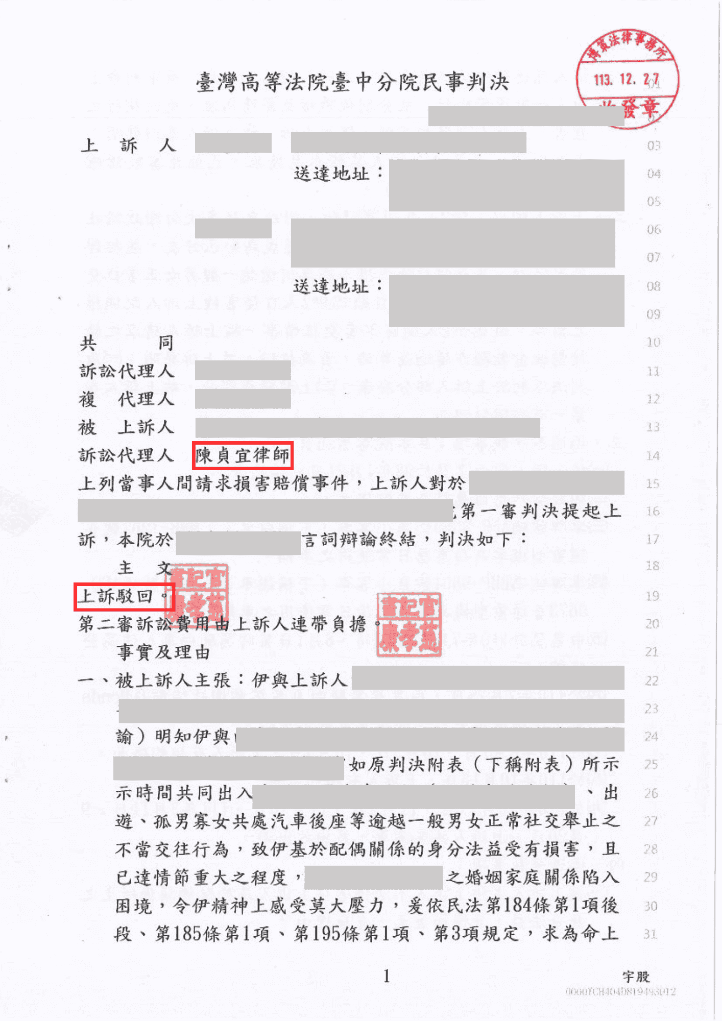 陳貞宜律師侵害配偶權勝訴,對方上訴不付賠償金失敗-法巢
