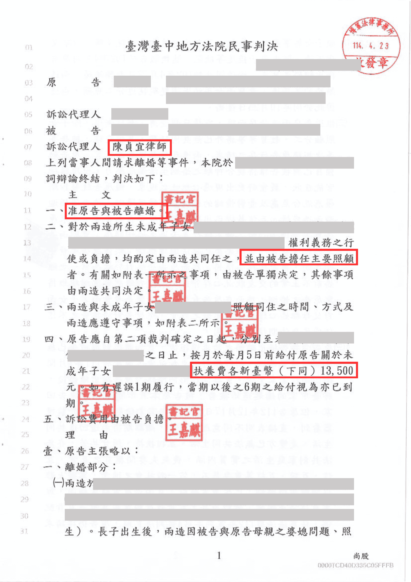 陳貞宜律師離婚勝訴,獲得扶養費 2.7 萬-法巢