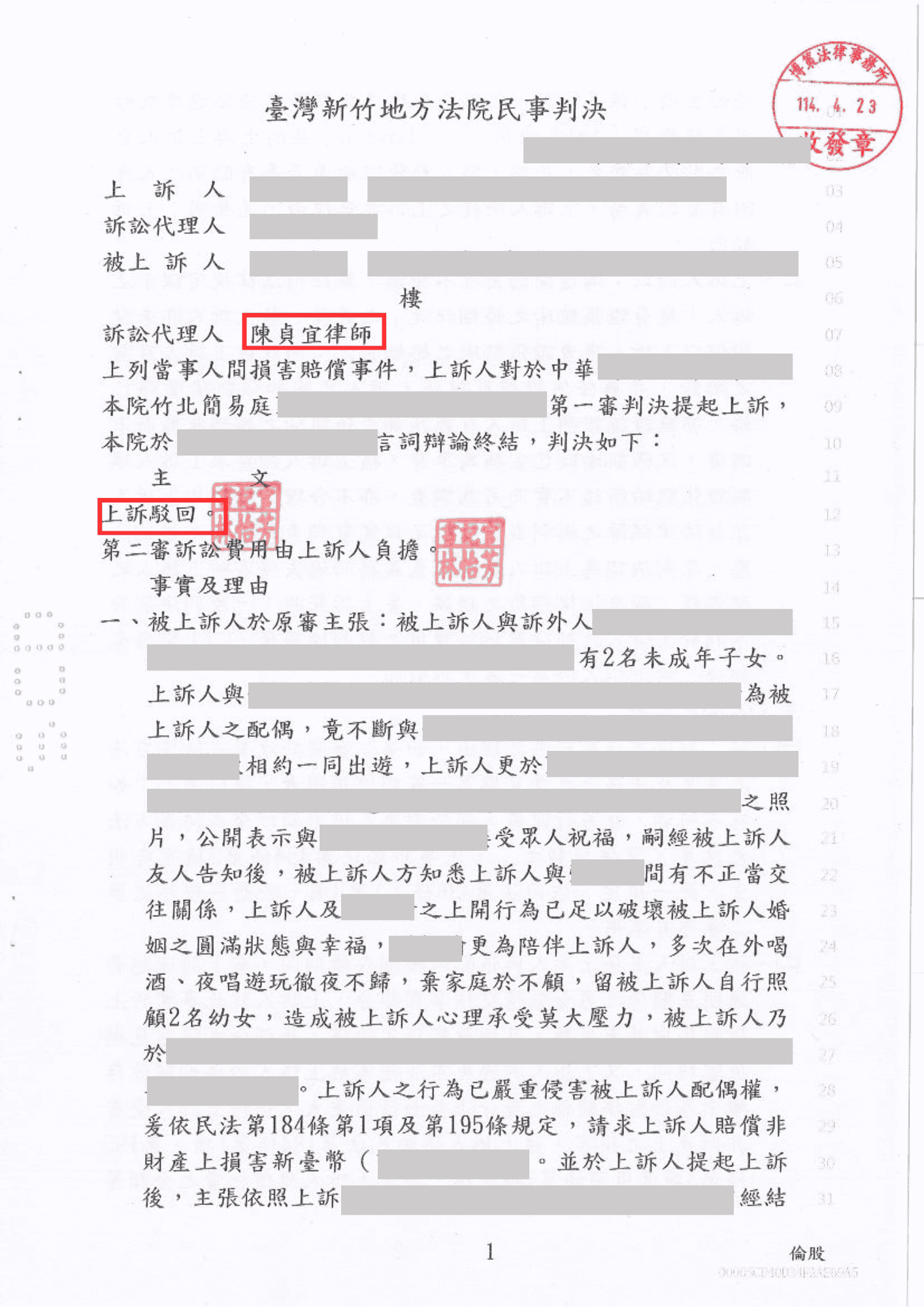 陳貞宜律師侵害配偶權勝訴,對方要求賠償失敗-法巢