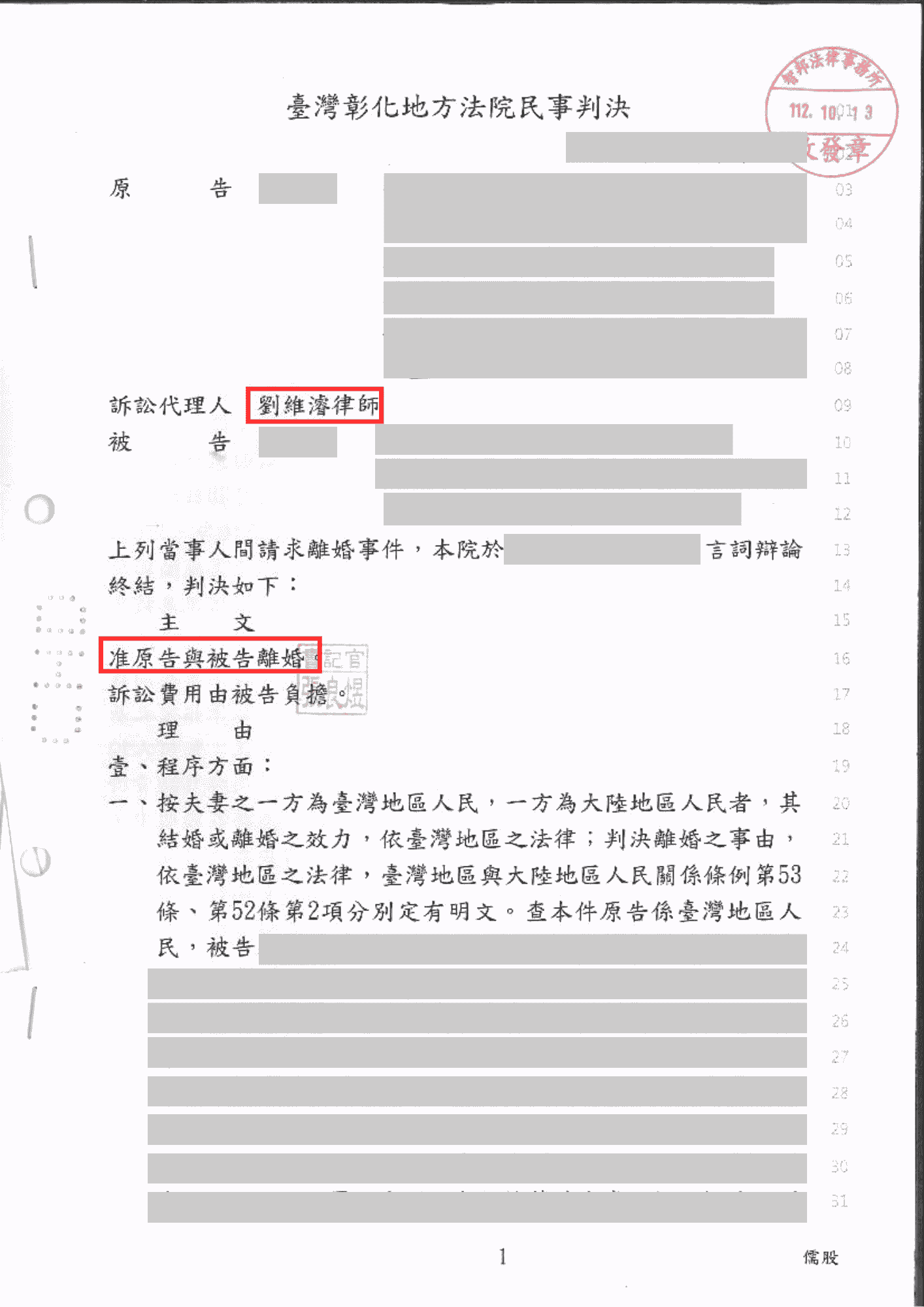 劉維濬律師離婚勝訴,大陸配偶離婚成功-法巢