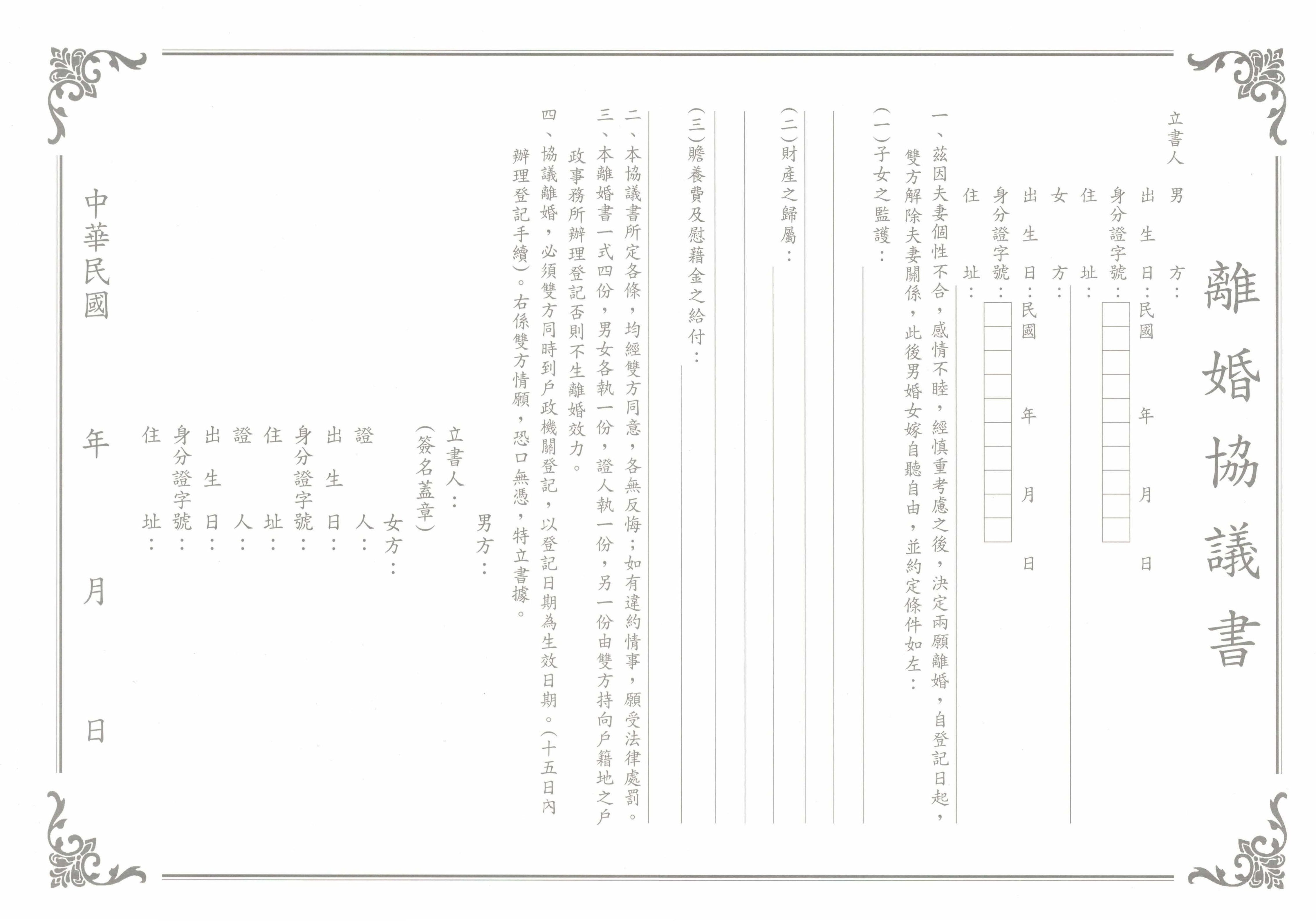 1. 離婚協議書一式三份(夫妻雙方各執一份,ㄧ份戶政留存,如夫妻雙方辦理離婚後所執離婚協議書不見,日後可以至戶政調取)