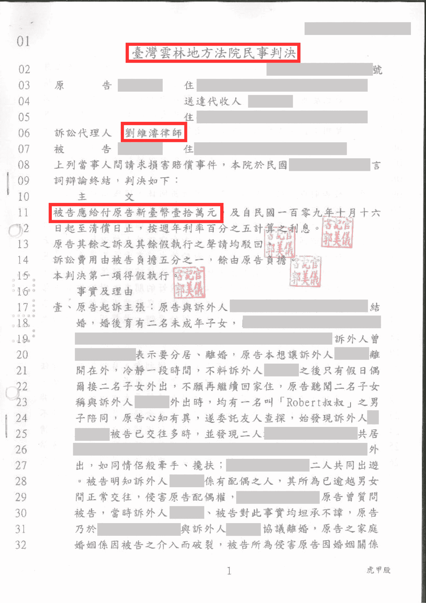 在訴訟中,劉律師成功讓法院認定R先生有侵害配偶權的行為: