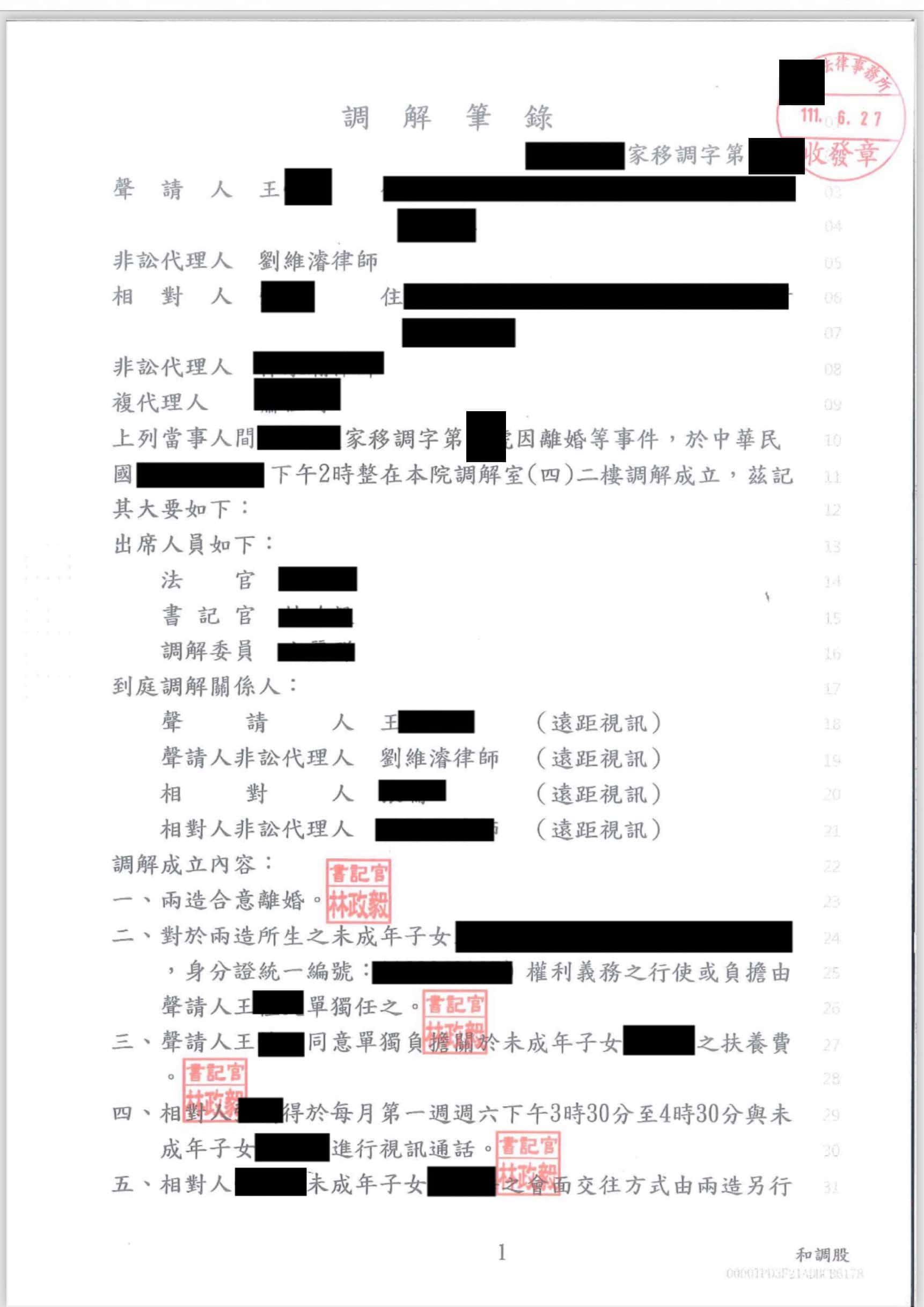 劉律師運用其在家事案件處理上的經驗,在正式訴訟前即透過法院調解程序與對方進行溝通。由於對方身處中國,也不想再回台灣應訴,便在律師協助安排下完成以下調解條件: