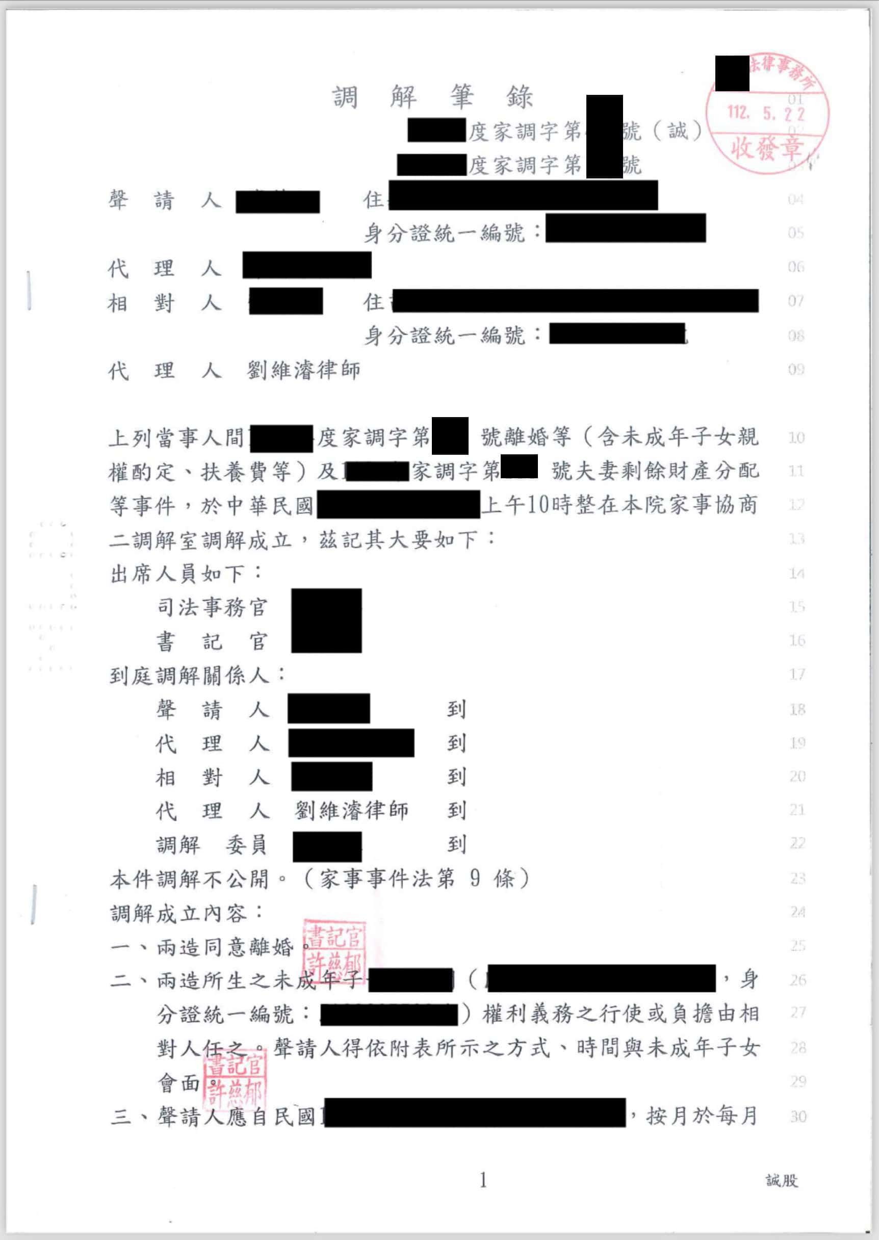 在法院主持下完成家事調解程序後,本案最終結果如下: