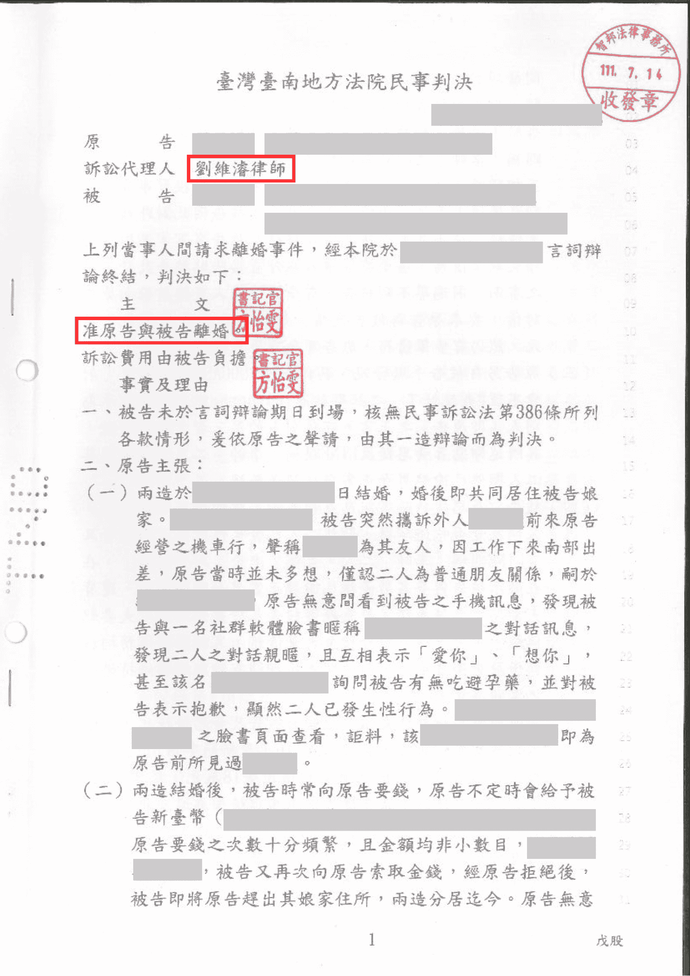 劉維濬律師離婚勝訴,妻子外遇離婚成功-法巢