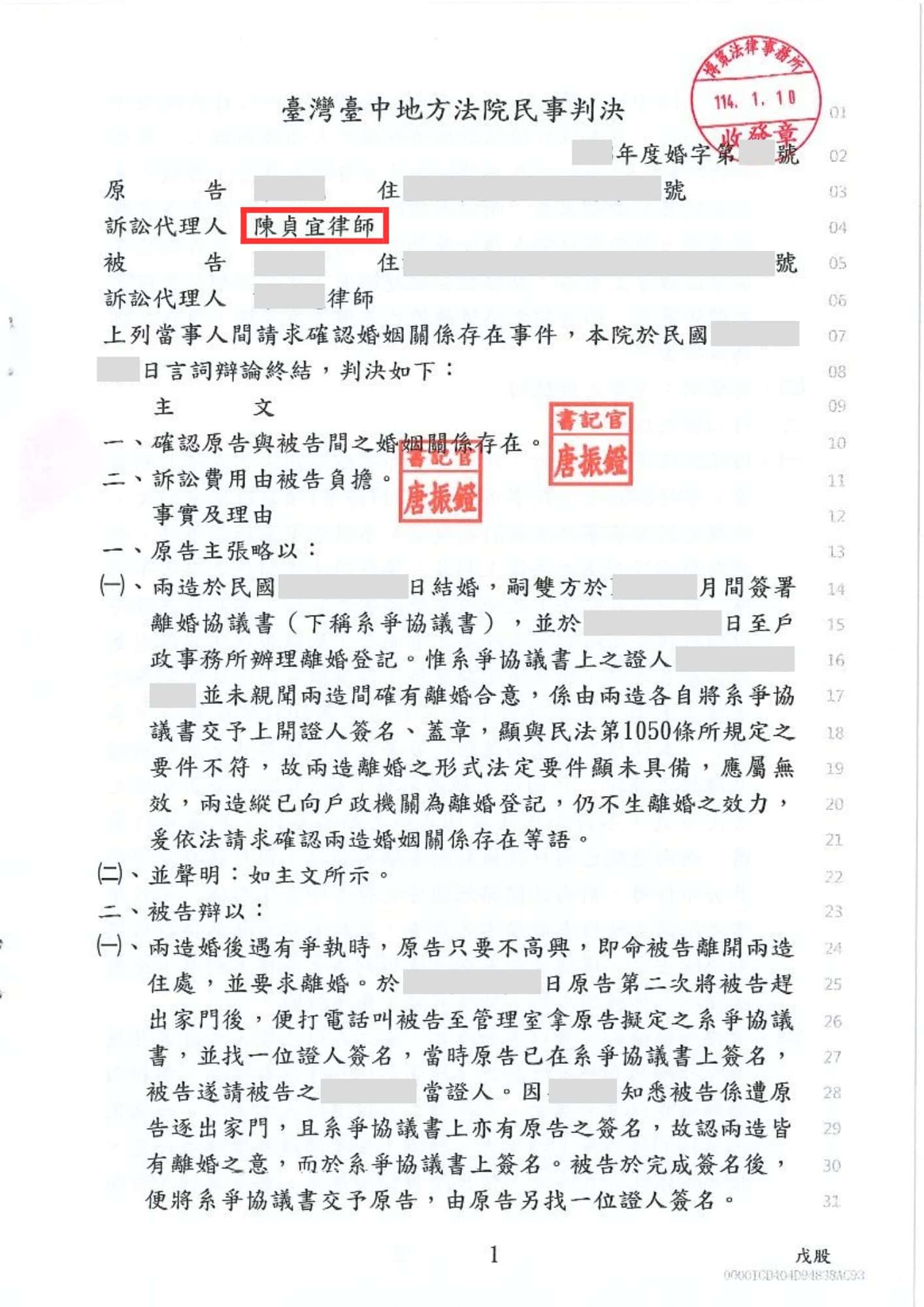 【離婚後反悔能挽回嗎?】離婚協議書證人不合法,C先生委任離婚律師-陳貞宜提起離婚無效訴訟勝訴!-法巢