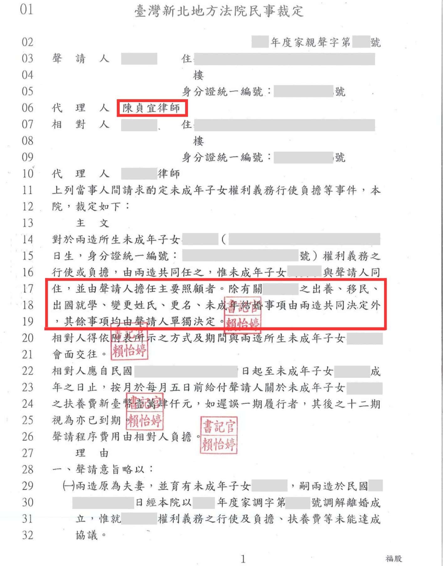 ⚖️ 法庭攻防:離婚律師陳貞宜成功主張主要照顧者+扶養費